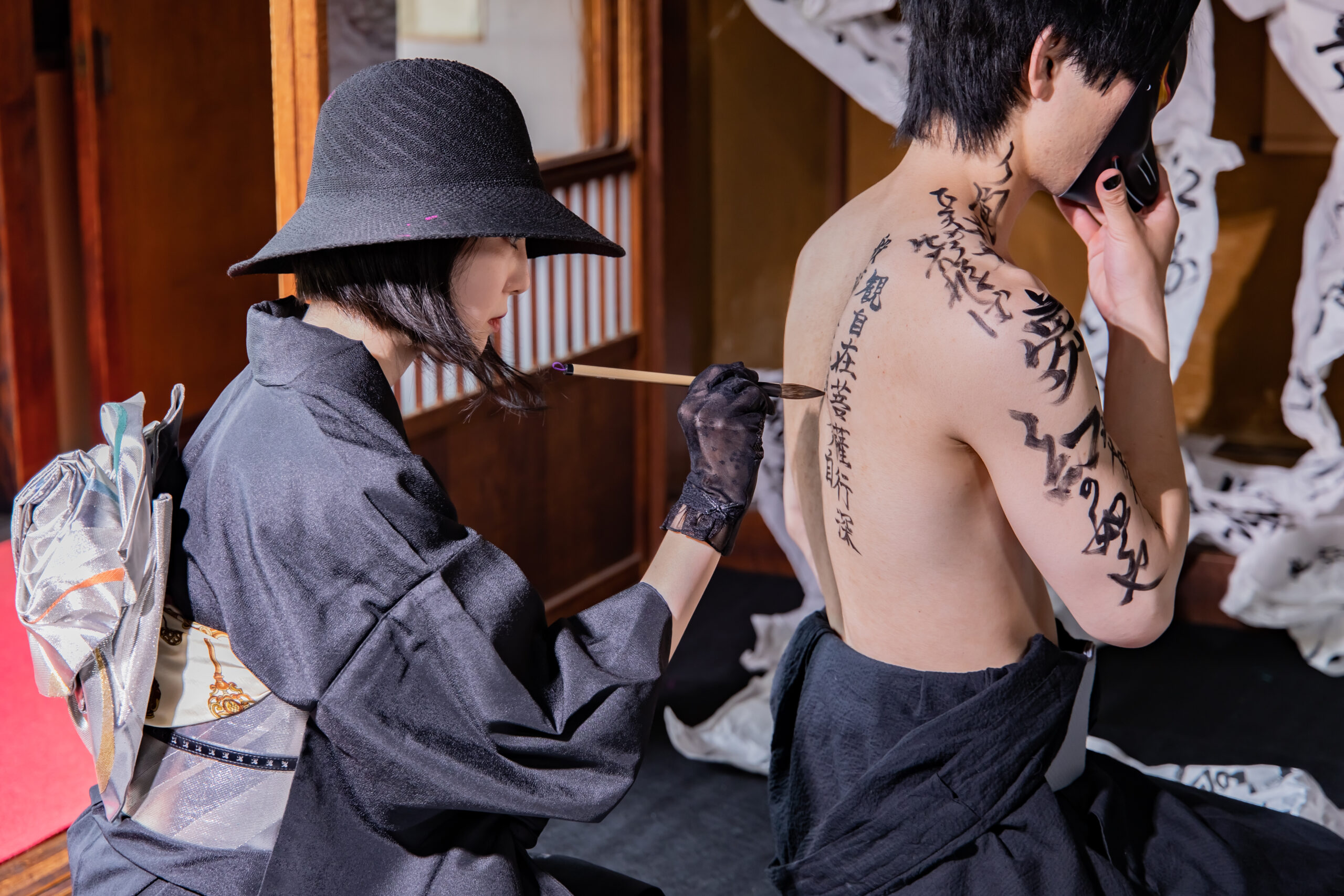 The canvas of calligraphy extends to space and the human body itself. In “Body Calligraphy,” where ink flows across bodies possessing warmth, curves, and contours, sensual lines are created that could never emerge on paper. Furthermore, taking the information-saturated modern society as its theme, installations unfold where calligraphy is deliberately crumpled to fill walls and ceilings. This “calligraphy as noise,” not intended for reading, prompts viewers to question their own selection and rejection of information.